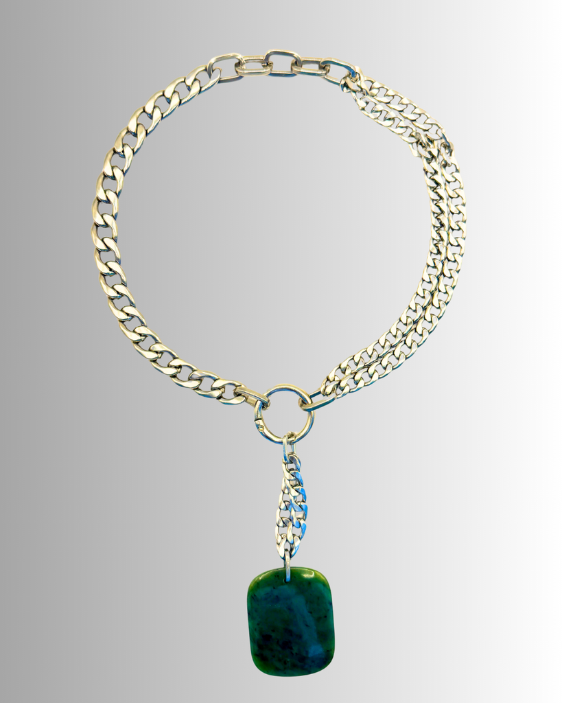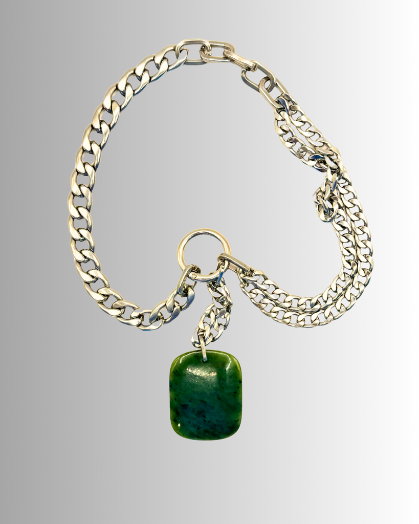 This piece reflects that spirit. A bold 304 stainless steel Cuban link chain in silver anchors the design, giving it a confident and modern presence. Suspended from the chain is a striking piece of pounamu sourced from the riverbeds of the West Coast of the South Island of Aotearoa New Zealand. The cool strength of steel meets the natural depth of greenstone, creating a balance between contemporary design and the enduring beauty of the natural world.