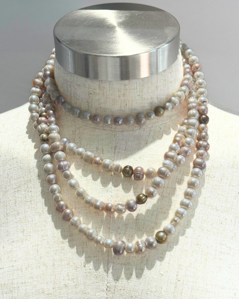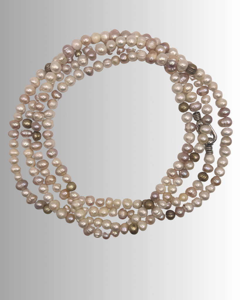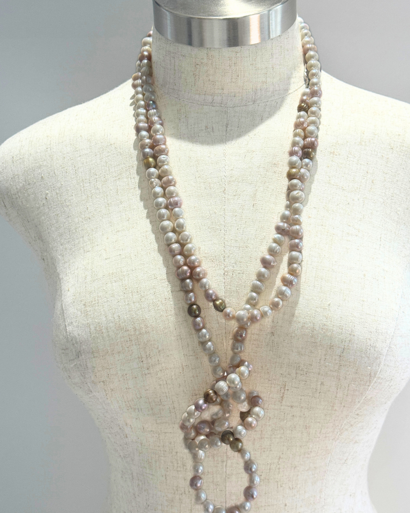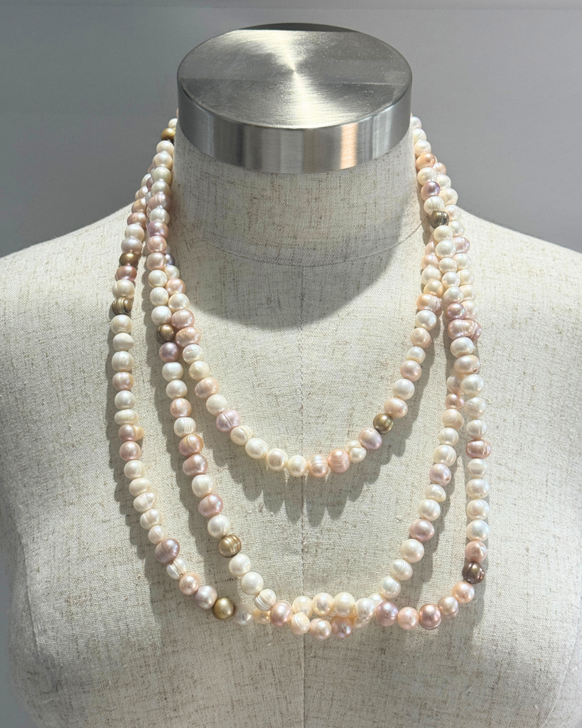 This extraordinary strand is composed of natural freshwater pearls in soft tones of blush pink, lavender, cream and metallic gold. Each pearl is slightly unique in shape and tone, creating a subtle, organic rhythm of colour and light.